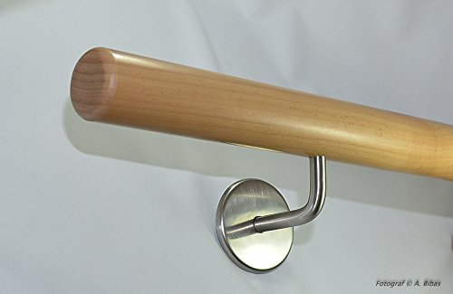 PRODUCT DESCRIPTIONS:Set - beechwood handrail, varnished, Length: 1000mm, Set contents: beech handrail - diameter 45mm, 2 brackets for screwing - satin stainless steel V2A. Handrail Bracket : Wall distance: 70mm , Ronde: about 60mm, base plate with 6 holes - Diameter: 9mm, cover - Height: 10mm, suitable for large screw, heads are only pressed, round steel - Diameter: 12mm, holes for the bracket in the handrail are already prepared. On request: special dimensions for the holes of the holder. The handrail is 2x painted - with a food grade varnish. Installation of the handrail: Screw Brackets: push the rosette of the holder of the base plate. Hold the handrail on the wall and mark the hole points. Then with a 10mm carbide drill ( depending on wall ) Drill dowel holes 10mm . Anchors and screws are included. Now, the handrail can be mounted. Cap ( Cover plates ) easily press on the base plate. Ready.