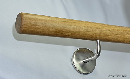 PRODUCT DESCRIPTIONS:Varnished oak handrail set, length: 1300mm, set contents: round oak handrail (diameter 45mm), 2 screw-in wall holders (matte V2A stainless steel). Handrail brackets: wall distance approx. 70mm, circular wall base plate diameter approx. 60mm with 6 screw holes (diameter of screw holes 9mm). Cover plate - height: 10mm, suitable for large screw heads (simply push on). Round steel bar - diameter: 12mm, screw holes for the bracket are pre-drilled in the handrail. Special measurements for the bracket drill holes are available on request. The handrail has been varnished twice with a non-toxic, food-grade varnish. The varnish is also used in public buildings and nurseries, for example. Installing the handrail: screw in the bracket and push the bracket rosettes off the base plate. Hold the handrail against the wall and move the drill points into place. Then drill the 10mm holes using a 10mm carbide drill (depending on the type of wall). Wall plugs and screws are included. Now you can attach the handrail. Simply push the end caps (cover rosettes) lightly onto the end of the hand rail. And you're done!