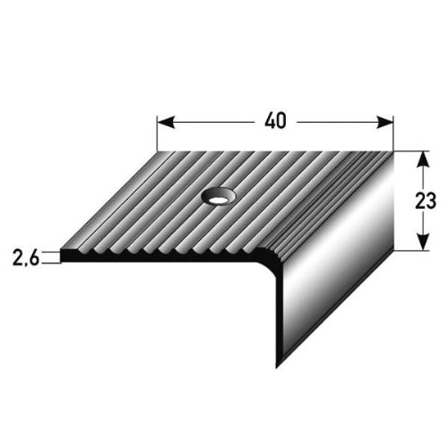 PRODUCT DESCRIPTIONS:This stair nosing with dimensions 23 x 40 mm is an angle profile made from high-quality aluminium, with a tread on the upper side with a width of 40 mm and a height of 23 mm. This stair nosing consists of multiple profiles with a length of 1 m each.